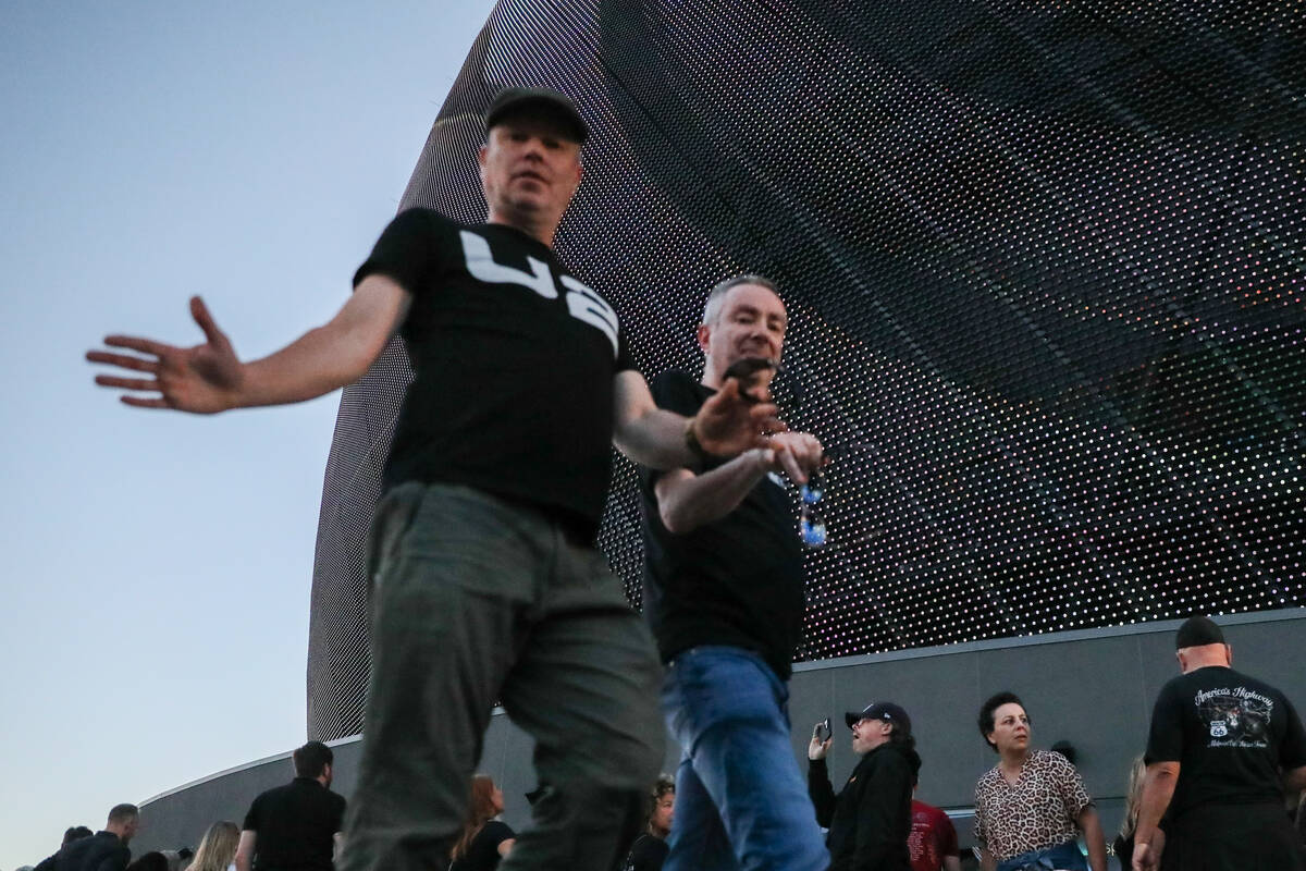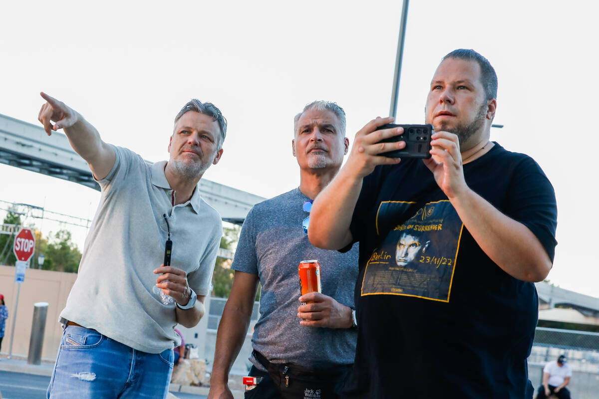 Jörg Uetzmann, from right, Oliver Borges, and Harry Niepelt, flew in from Germany to watch the inaugural performance at the Sphere featuring U2 on Friday, Sept. 29, 2023 in Las Vegas. (Daniel Pearson/Las Vegas Review-Journal)