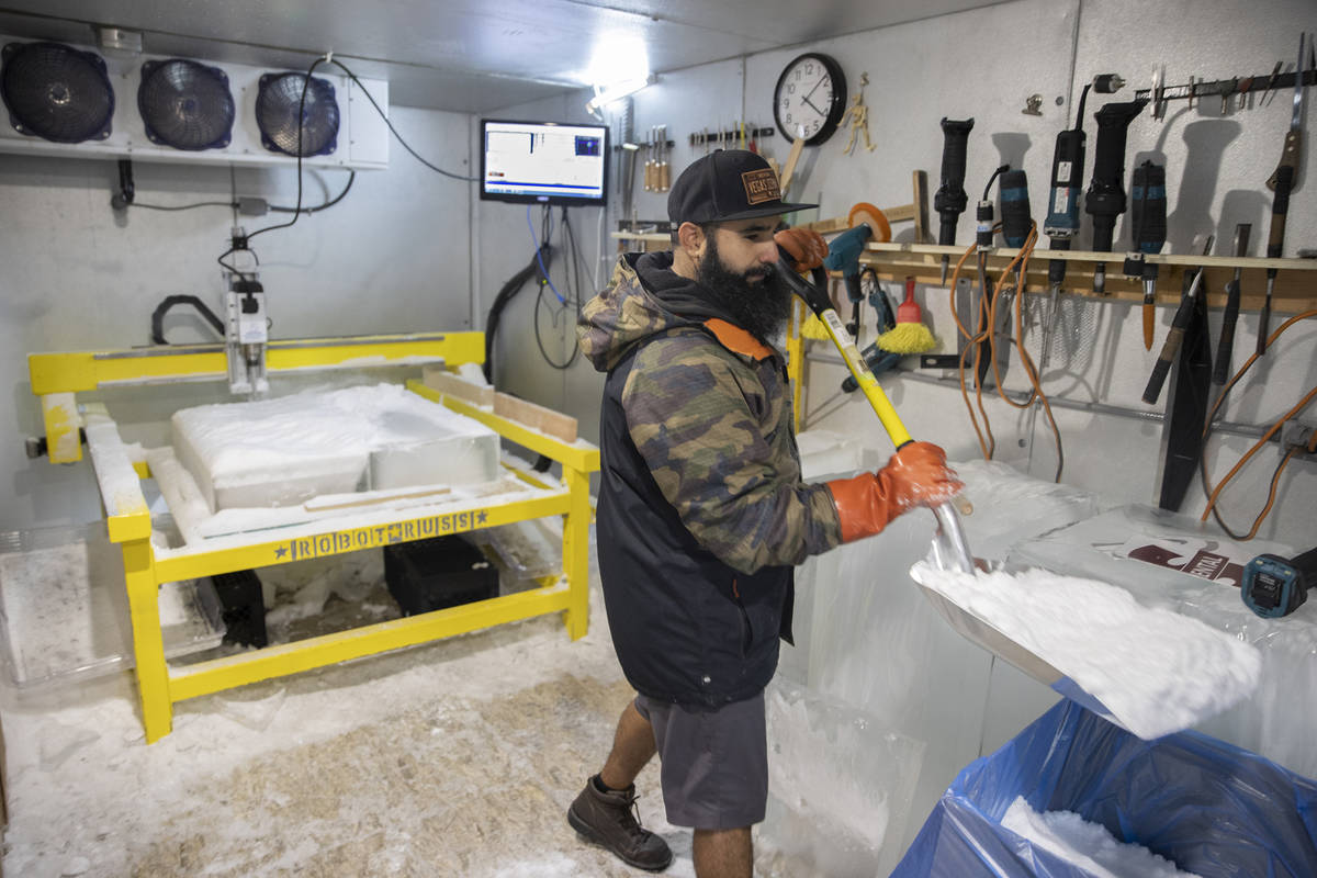The speed of the router as it works its way through a 300-pound block of ice can change the snow’s consistency, Villarreal says. He found the filtered water he uses to produce clear ice for sculpting makes for inferior snow.