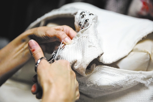 Corporon learned to sew in middle school. When her own career as a dancer ended, she joined her husband as an “Ice Capades” employee. He was an electrician; she worked in wardrobe. Richard Corporon remains in the business as master electrician for “Jubilee!” at Bally’s.