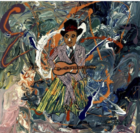 "The Jazzman of Bebop Blues" reveals saxophonist Cannonball Adderley, portly and serene, simply sitting and performing. But "Jazz on Tenth Avenue" features a frenzied amalgam of colors and a jutting one-way city sign, signaling the energy of street musicians. "Foundation of the Blues" captures Delta blues pioneer Robert Johnson in a dapper suit, guitar in hand, the central focus against a curling mass of rainbow hues for a look evocative of a legendary painter.