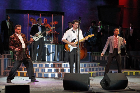 Though the crash that cut deep into America's musical soul is referenced -- a DJ's voice announces the tragedy -- "Buddy" climaxes on a Holly high as he, the Bopper and Valens return to the stage for a 30-minute hitsville concert, backed by additional brass and keyboard players.