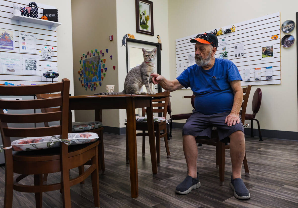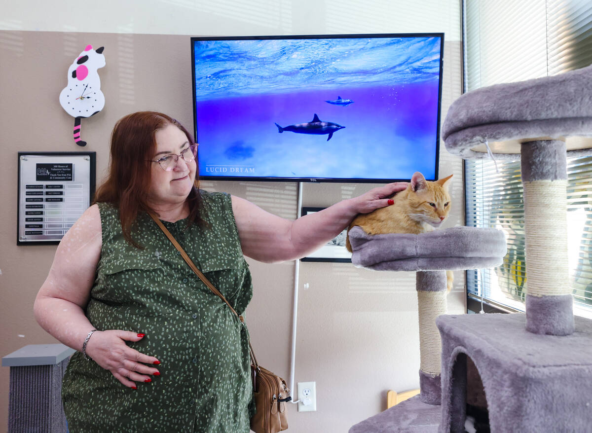 Linda Archambault beamed as she petted a cat that has demanded her attention at Hearts Alive Cat Café.