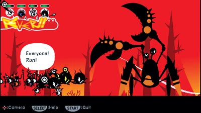 And to make your little guys march, fight and shield themselves, you press a series of buttons as if you were banging different drumheads, on the beat, in sync with music that's reminiscent of the indie-pop band the Tom Tom Club.