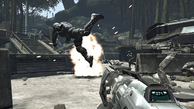 The story line is a contemporary first-person shooter. You run as a soldier on a crazy planet, which resembles scenes from "Jurassic Park" and "King Kong." Your mission is to kill soldier-minions en route to a big bad guy named Kane, who went nuts with power.