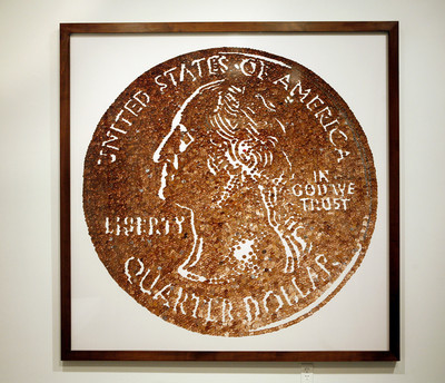 "The Thinker," Saint Clair Cemin's startling figure, resembles, at first glance, a pensive, stainless steel Michelin Man, waves of cascading ridges coalescing into a form splayed on the ground, legs apart, featureless head tilted down as if deep in thought. Massimo Vitali's chromogenic print, "Anfi Single," is an idyllic beach depiction, beautiful white sand peppered with humanity in seaside repose on the sand and in the water. And Vik Muniz's fascinating "Small Change" depicts a giant quarter assembled out of a mass of pennies. Every detail, including George Washington's indelible profile, is meticulously re-created.