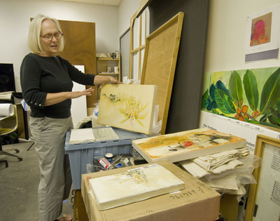 For the past 20 years, she has balanced teaching with painting in her UNLV studio and at home. Her early work is almost all narrative, but she is most known for botanical drawings and paintings of bees on flowers, butterflies, delicate blossoms in pastel hues, all literal interpretations of a world that exists mostly in her backyard.
