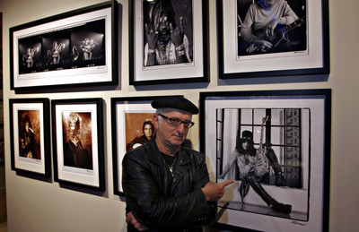The exhibit's a potpourri of rockers in midrock, and repose: Mick Jagger, serpentine style caught in midslither; guitar-wielding Eddie Van Halen scissor-kicking in midair; B.B. King, head tossed back in a joyous laugh in one shot, eyes closed in concentration as he strums in another; craggy Johnny Cash, weathered mug resembling a dry riverbed; Billy Idol, left side of his haunting profile cloaked in shadow; Ray Charles at the piano, stage lights sparkling off his dark glasses.