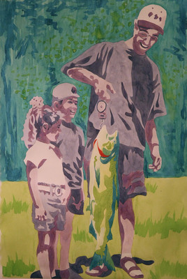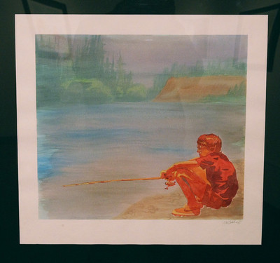 Gentility distinguishes "Prize," as a man in a boat, ballcap on backward, holds up his catch, serene blue lake waters rolling beneath green trees. More action informs "Battle," as a man wielding a net and a boy with a pole pursue unseen prey from onshore, and "Bent," as a fisherman's taut line arches over, hooked into a worthy underwater adversary. And in "Patience," a boy, rendered in bold red, pole stuck out straight, just waits for whatever might, or might not, soon happen. It's life in repose, a celebration of stillness.