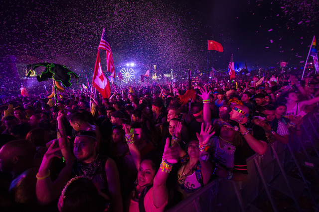 They’re tied around attendee’s necks like capes and billowing from poles above the masses. Two Canadian men wear their country’s flag, along with a bear hat and colorful kandi beads. A group of women carries both a Mexican and a French flag among them.