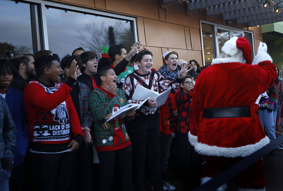 Choirs from Gunderson Middle School and Coronado High School greet Santa during the annual lighting ceremony at the Ethel M Chocolates’ Cactus Garden, Friday, Nov. 4, 2022, in Henderson. (Chitose Suzuki/Las Vegas Review-Journal) @chitosephoto