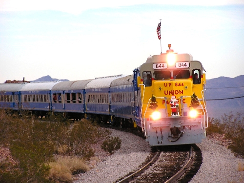 The Santa Train, which seats 300 in five cars, travels on 3.5 miles of track laid in 1931 to haul cement and steel to the Hoover Dam construction site. It's pulled by a 2,500-horsepower Union Pacifiç diesel engine.