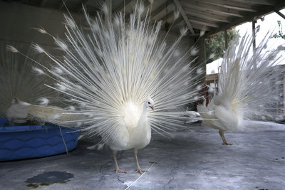 At the peacock display, the white wonders are stop-you-in-your-tracks breathtaking, especially as several fan out their tail feathers in their signature pose -- the male's way of asking the female, "Hey, doll-face, how about a date?" Add a splash of color and these peacocks could score gigs at NBC.