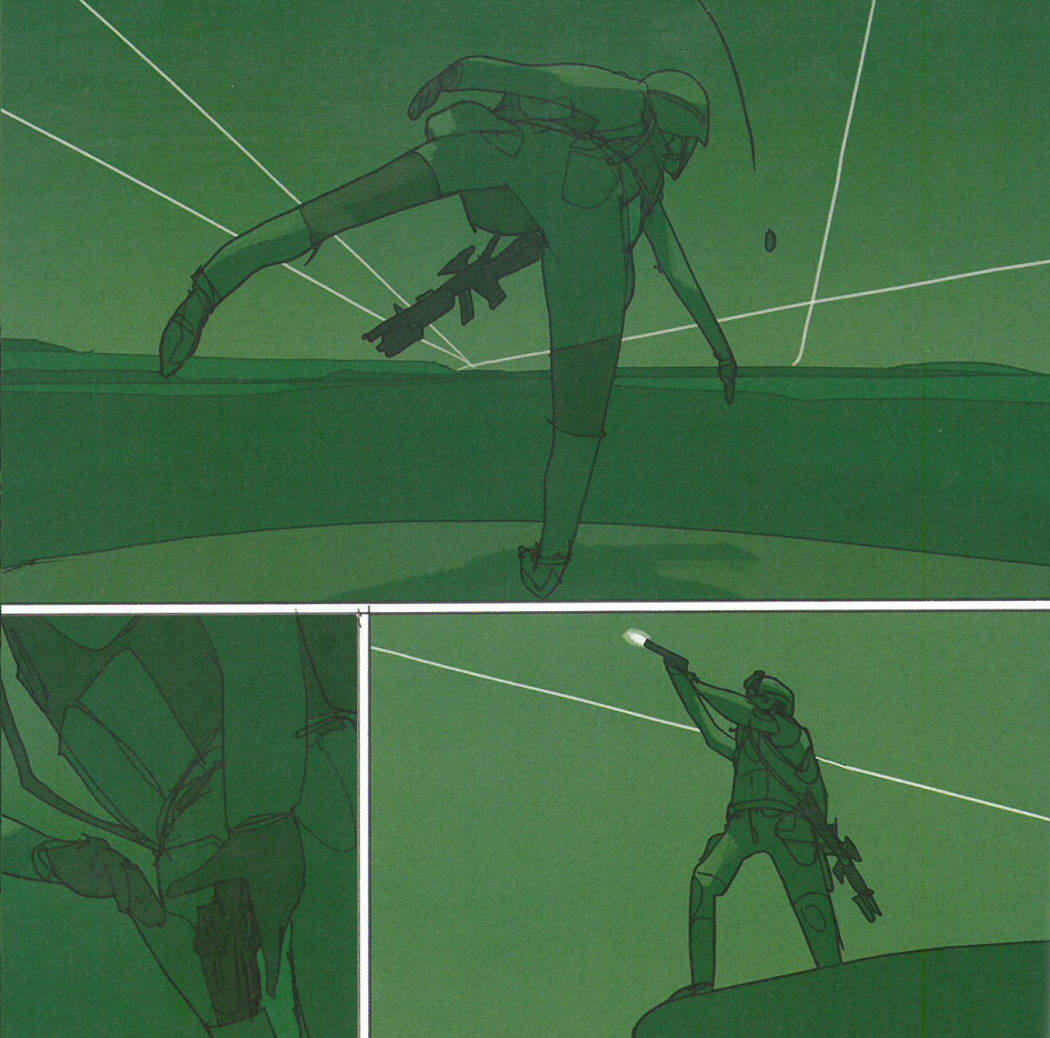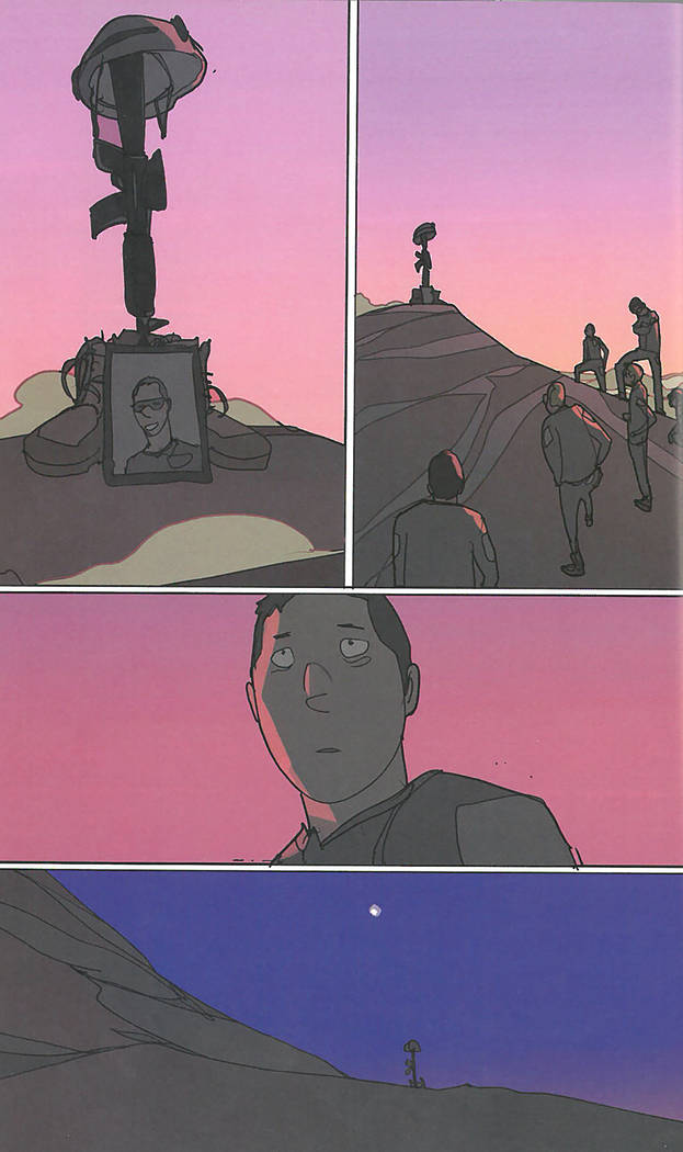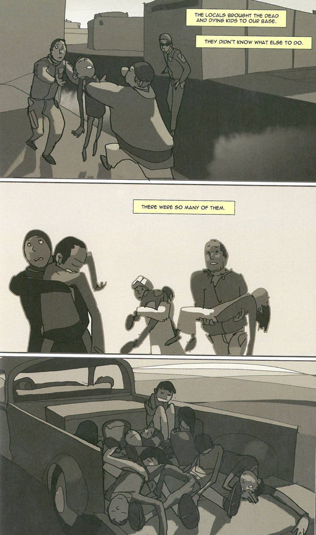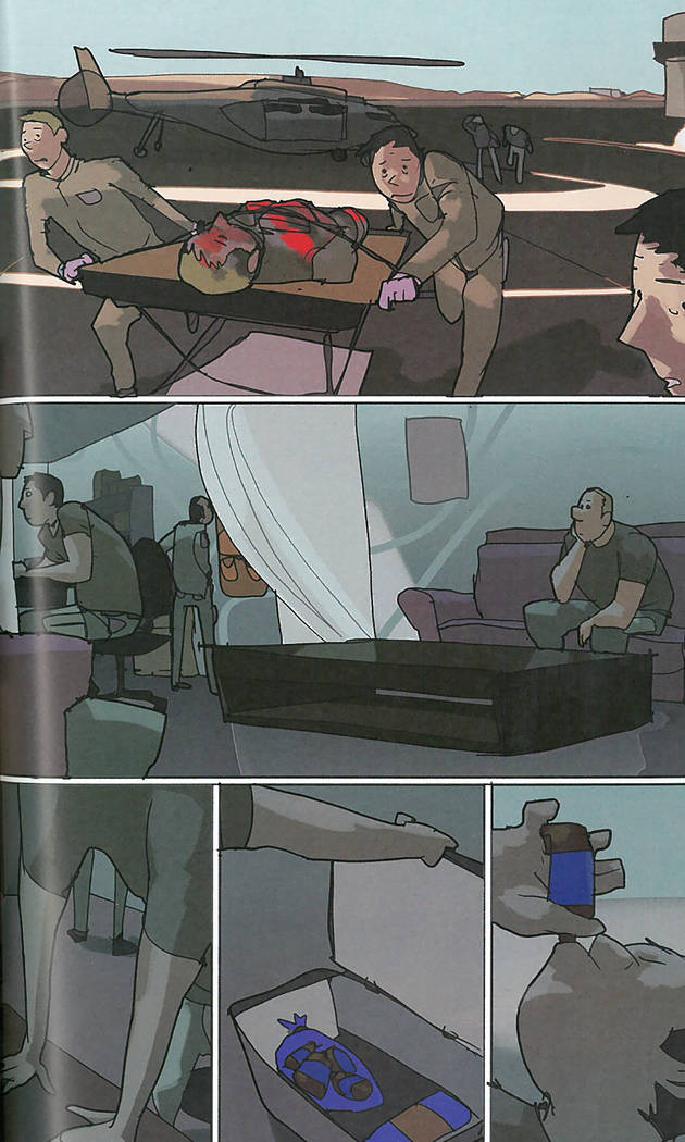 The book does have scenes that depict combat and the bloody chaos of an aid station. But just as brutal are a few pages at the beginning — the ones that show a soul-deadened Dulak before he ships out — that illustrate the emotional violence of war.