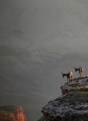 "Bighorn Sheep" depicts a pair looking down over a cliff on what seems like the edge of forever, a scene Geri and Wayne put to dual use. "That was our Christmas card," Wayne says. "You open the card and it looks like they're having a discussion and they say, 'Who pushed Rudolph?' "