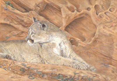 A lion reclines on a rocky slab, head sharply swiveled in opposition to its body, as if suddenly alerted to a disturbance just beyond the edge of the painter's canvas. A cliff, like a cloud, plays games with the mind's eye, a dignified horse seemingly emerging from the rock formation as if leading a chariot. Ancient petroglyphs pop out of a dishwater-gray wall, a burst of nature's graffiti. A banded Gila monster's thick, scaly, black and orange bulk argues that even ugliness has its own beauty. A zebra-tailed lizard strikes a pose as if auditioning to become the next GEICO spokes-reptile.
