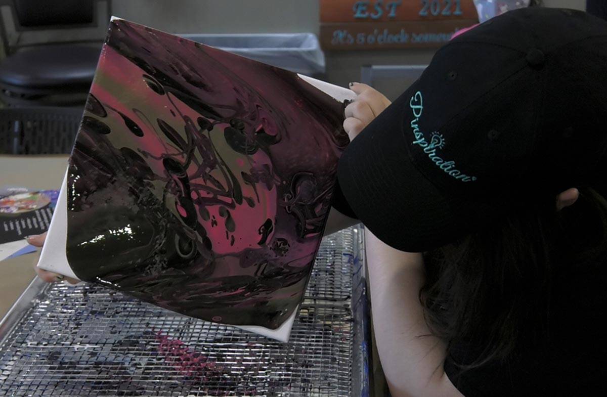 Groups who visit Pinspiration can work on individual projects like acrylic pours in which thin paint is swirled together over canvas and fiber arts that combine wood and macrame.