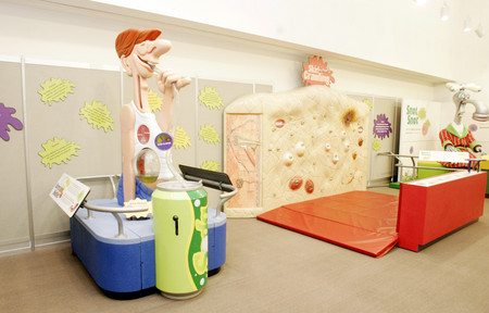 The exhibit features a display devoted to the human body and its smells, from armpit to feet to behind; a climbing wall of human skin equipped with everything from pimples to warts; and displays devoted to burps, urine, digestion and vomit.