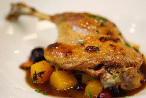 This duck-confit appetizer is made with vanilla roasted pumpkin, pomegranate, sour cherry duck jus and salted roasted pumpkin seed and is $14.