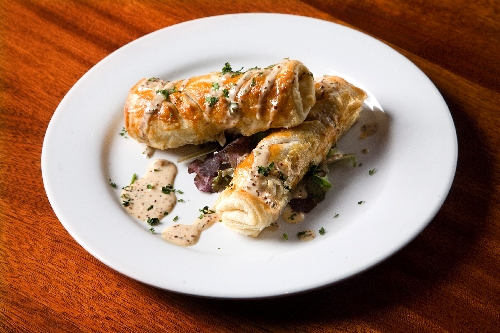 Irish bangers are enclosed in pastry and served with a Guinness mustard sauce, $9.95.