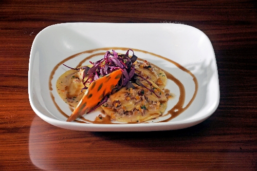 Pasta pockets filled with pumpkin puree and goat cheese are flavored with bourbon maple syrup, whiskey and brown butter and topped with pumpkin-seed brittle, $15.