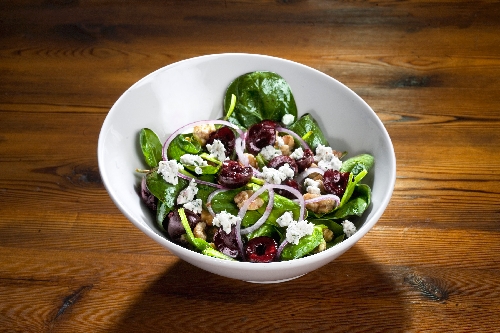 Fresh cherry and spinach salad topped with walnuts and herbed goat cheese and tossed with lemon vinaigrette, $10.95.