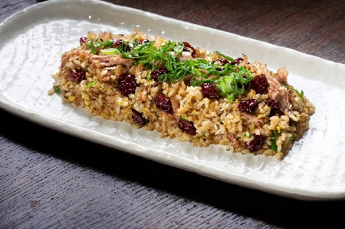 Fried brown rice is tossed with five-spiced duck confit, egg, scallions and dried Michigan cherries, $23.