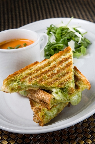 An Italian version of grilled cheese, made with fresh mozzarella, is served at lunch with mixed greens and tomato soup, $14.
