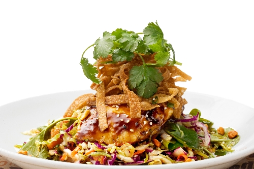 Chicken breast marinated in Asian seasonings is paired with julienned vegetables, tomato, peanuts, bean sprouts, cilantro and Spicy Thai dressing, $14.95 for full size, $9.95 for half.
