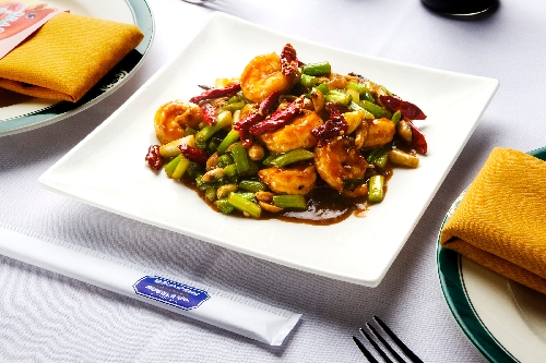 In this classic, shrimp and scallions are cooked in a spicy chili pepper sauce and garnished with roasted peanuts, $21.95.