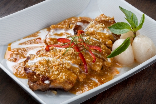 This twist on a traditional Thai coconut red curry is made with duck, lychee and ground peanuts, $20.
