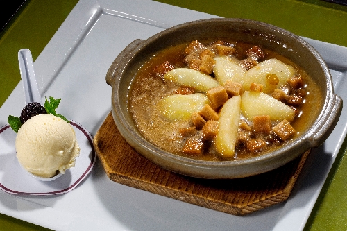 A mixture of Washington red and green apples and ginger sugar crumble is topped with honey-vanilla ice cream and served in a hot clay pot, $14.