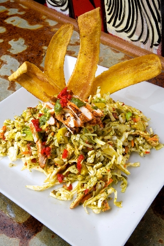 Chicken is tossed with cabbage, jicama, piquillo peppers, pumpkin seeds, avocado, Manchego cheese and plantain chips and finished with a chimichurri-honey dressing, $11.