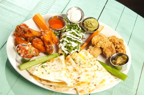 This entree presents chicken taquitos, a chicken quesadilla and chicken fingers with a variety of dipping sauces and carrots and celery, $27.99.