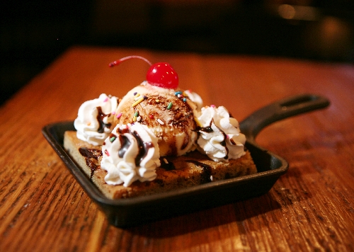 This giant chocolate chip cookie is topped with vanilla Blue Bell ice cream, chopped nuts and hot fudge, $6.95.