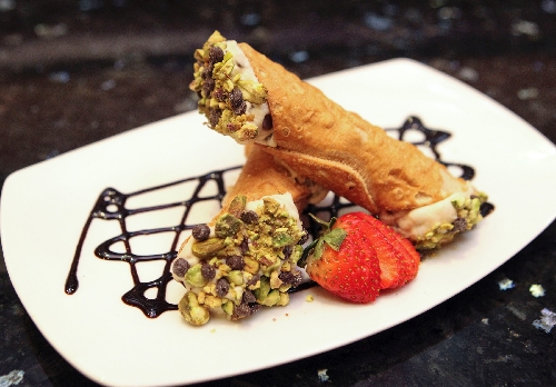 The crisp pastry tube is filled with a silken ricotta-cream filling, crusted with pistachio and chocolate bits, $4.99.