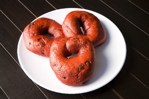 The traditional red-velvet dough is studded with chunks of chocolate, $1, or $2.50 with cream cheese.
