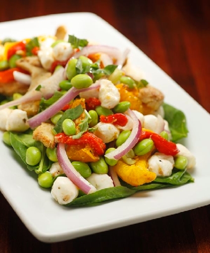 Spinach is accented with fresh mozzarella pearls, edamame, artichoke, yellow tomatoes, red bell pepper, onion and basil, $10.50.