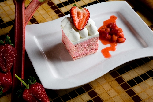 Cubes of light, strawberry-flavored chiffon cake are folded together with whipped cream and fresh strawberry puree, $7.95.