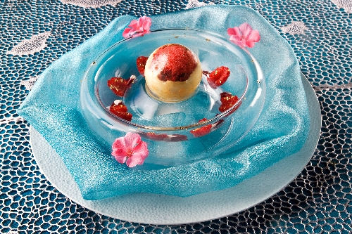 A bubble sugar sphere is filled with lemon mascarpone mousse and fresh strawberries, $25.