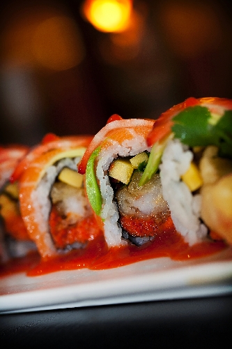 With shrimp tempura, spicy tuna, cilantro and mango on the inside, it's topped with salmon, avocado and strawberry and served in a spicy strawberry sauce, $18.