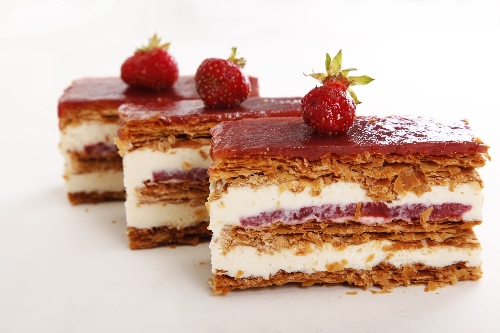 Cheesecake cream is layered with fresh strawberry jam and flaky pastry, $7.