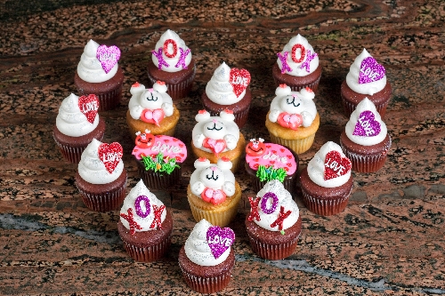 Three designs, atop red velvet with cream cheese or with vanilla or chocolate filling, sold singly or in four- or six-packs, $3 each and available through the end of the month.