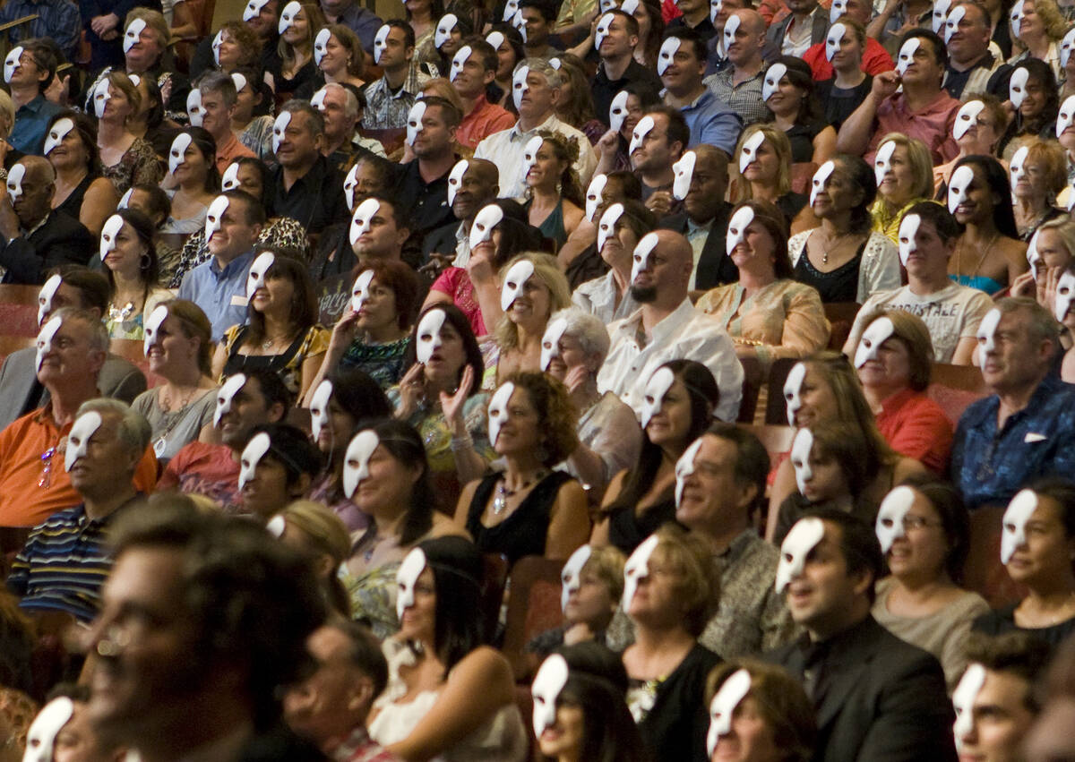 Members of the audience wear phantom masks prior to the start of the fourth anniversary performance of “Phantom – The Las Vegas Spectacular” at The Venetian hotel-casino on Thursday, June 24, 2010, in Las Vegas, Nevada. The audience was invited to become ‘Angels of Music’ by donning the masks for what has been characterized as the largest gathering of Phantoms ever. (DUANE PROKOP/LAS VEGAS REVIEW-JOURNAL)