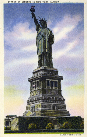 Boldly confronting a contemporary and controversial issue, New York's Harvey Weiss, in an inkjet print, portrays what appears to be a typical gift-shop postcard of the Statue of Liberty, until you look closely at the inscriptions: "Gay Marriage. Love Is a Higher Law."