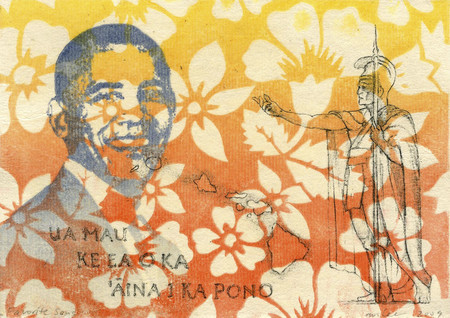 That's our Honolulu-born chief exec, President Barack Obama, on Maria Lee's depiction from Hawaii, against a pastel background, sharing space with King Kamehemeha in a piece titled "Favorite Sons."