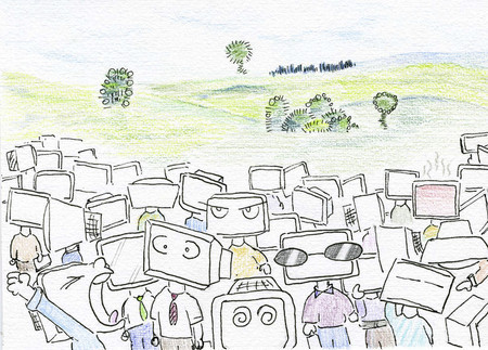 At the opposite end of the emotional spectrum, AnChi Chen's California entry, the bright, comical "Silicon Valley," employs color pencil and Micron pen to portray a gaggle of cartoon people with rectangular computer heads in various expressions of confusion and contentment.