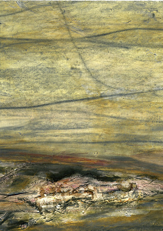 In "Renew Orleans," a sobering reference to devastation wrought by Hurricane Katrina, Louisiana artist Jesse Royston is more abstract, using pencil and watercolor to create a dark, ominous brown backdrop over what appears to be random wreckage.