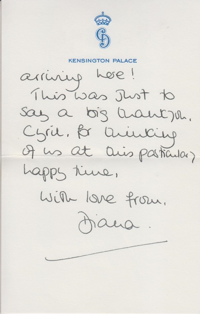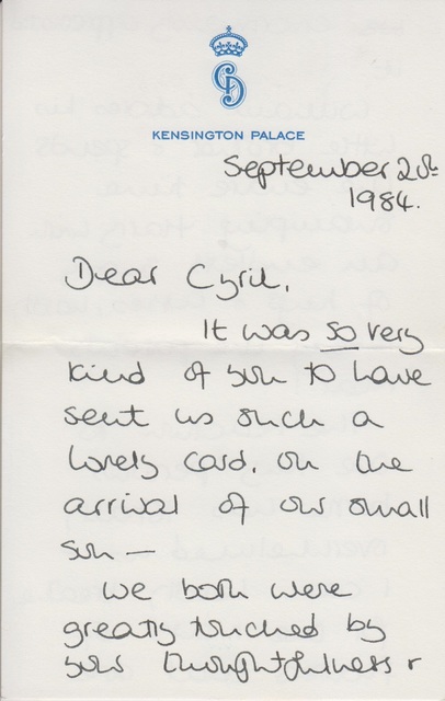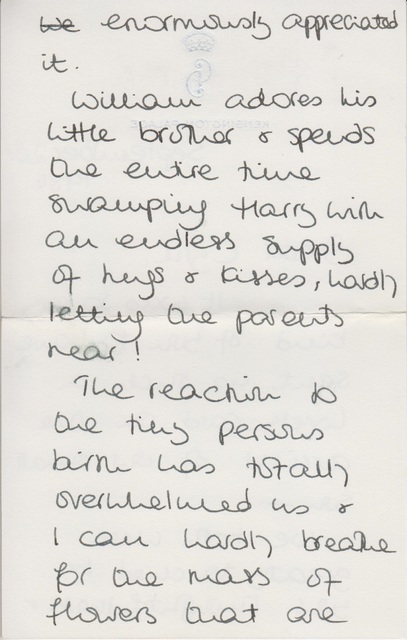 In one, sent five days after Harry’s birth in September 1984, Diana thanked Dickman for a card he sent during what she called “this particularly happy time” and described how affectionate Prince William was toward his baby brother.