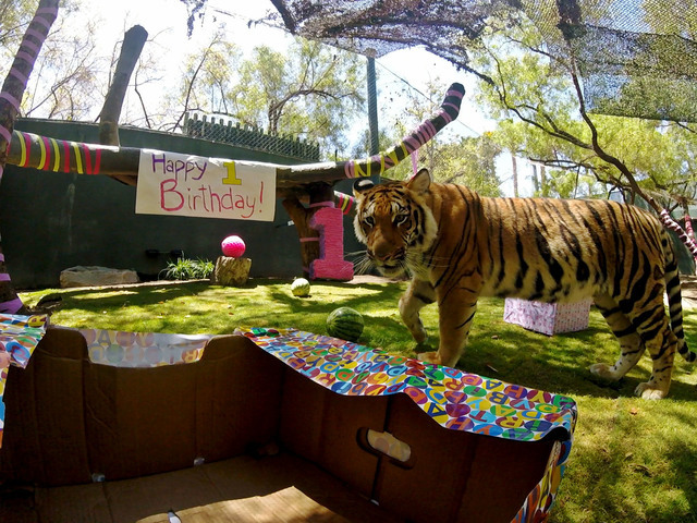 The sisters, born a year ago to mother Indira and father Svengali, frolicked with a happy birthday banner and “1” pinatas while guests were treated to cookies decorated with white tigers, according to a press release.
