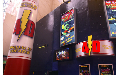 Inside the 46-seat theater, a Marvin the Martian cartoon unspools -- special guest star Daffy Duck, how dethhhhspicable! -- supplemented by a host of sensory surprises, as the rigged seats and special effects underline the 4-D antics. Expect to be spritzed (the aforementioned spitter), poked, vibrated, air-puffed and assaulted by fluttering bubbles as the action leaps out straight at your eyeballs.